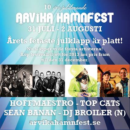 ”Årets fetaste julklapp är platt!” är Arvika hamnfests slogan för närvarande. Givetvis syftar de på biljetterna till hamnfesten 2014 (som man fram till nyår får till 2013 års pris). Detta föranleddes av att man presenterade de första akterna inför sommarens jubileumsfest: Hoffmaestro, Top Cats, Sean Banan och DJ Broiler (N). Jubileum? Jo, man firar faktiskt 10-årsjubileum. Grattis i förskott! 🙂