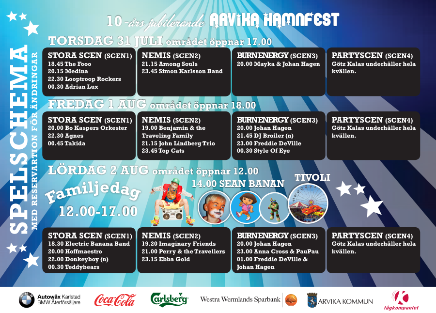 På lördagen blir det familjedag på festivalområdet. Sean Banan kommer att uppträda. Mer info om artister, biljetter, priser, tider med mera finns på Arvika Hamnfest hemsida.