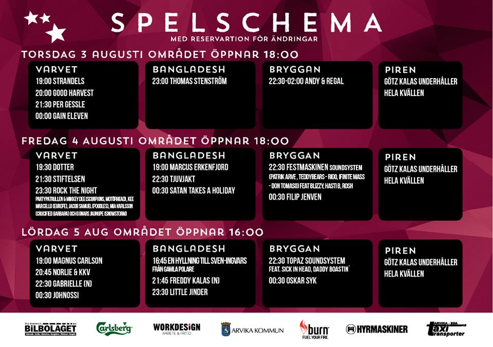 Årets artister är: Per Gessle, Johnossi, Dotter, Magnus Carlson, Stiftelsen, Thomas Stenström, Freddy Kalas (n), Good Harvest, Strandels, Norlie & KKV, Little Jinder, Gabrielle (n), Tjuvjakt, En Hyllning till Sven-Ingvars från Gamla Polare, Rock The Night med PartyPatrullen & gäster Mikkey Dee(Scorpions, Motörhead), Kee Marcello (Europe), Jacob Samuel (Poodles), Mia Karlsson (Crucified Barbara) och Gunars Jaunupe (Snowstorm), Satan Takes A Holiday, Festmaskinen Soundsystem med Patrik von Arfver, Rodde, DJ DonTomaso feat. ROSH, Blizzy, Hasti B, Filip Jenven, Oskar Syk, Topaz Soundsystem featuring Daddy Boastin’, Sick in Head, Gain Eleven, Andy&Regal, Götz Kalas, Marcus Erkenfjord (Klicka på bilden för en större version). Vill du höra hur de låter så klicka här för spellista.