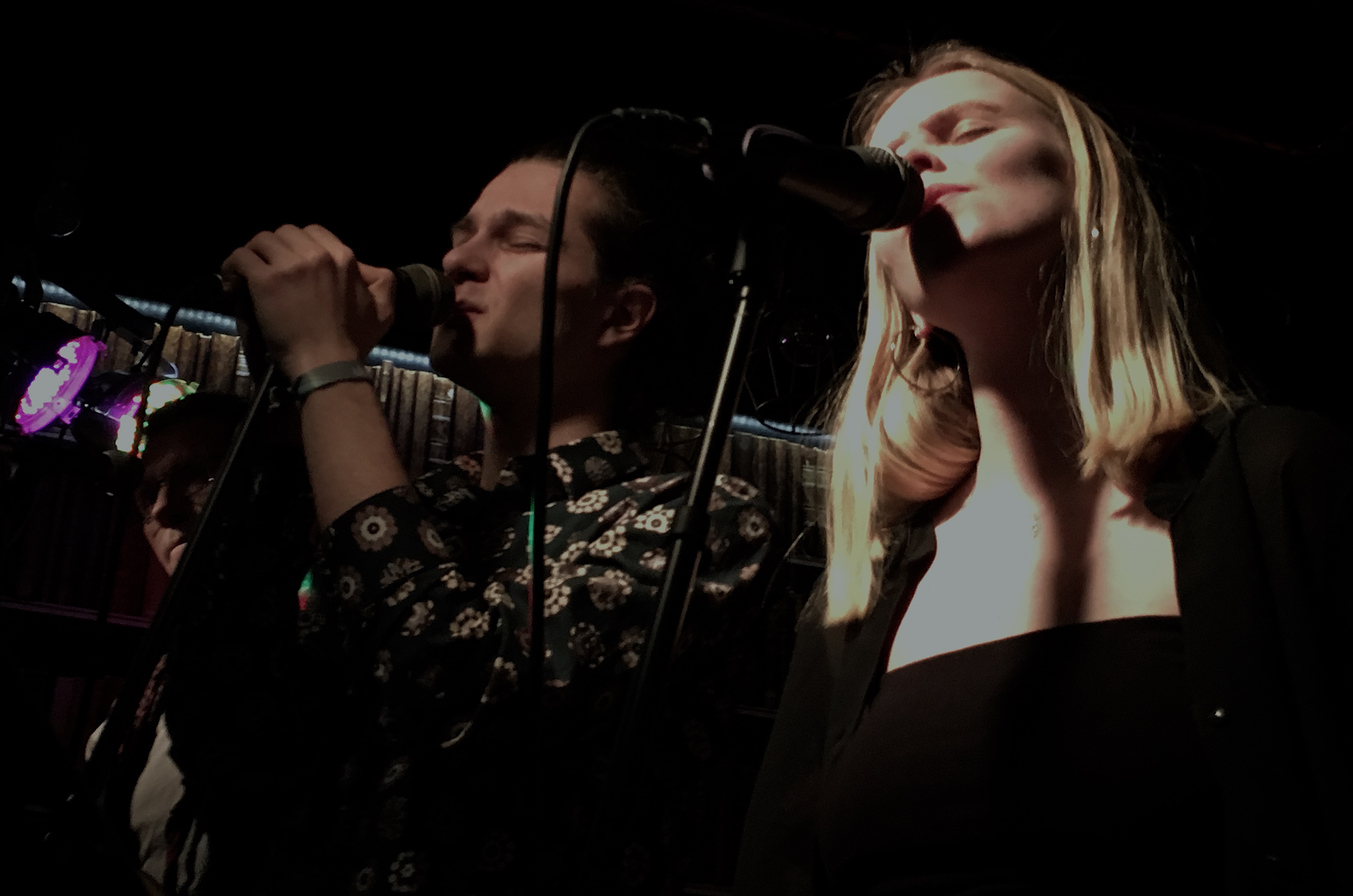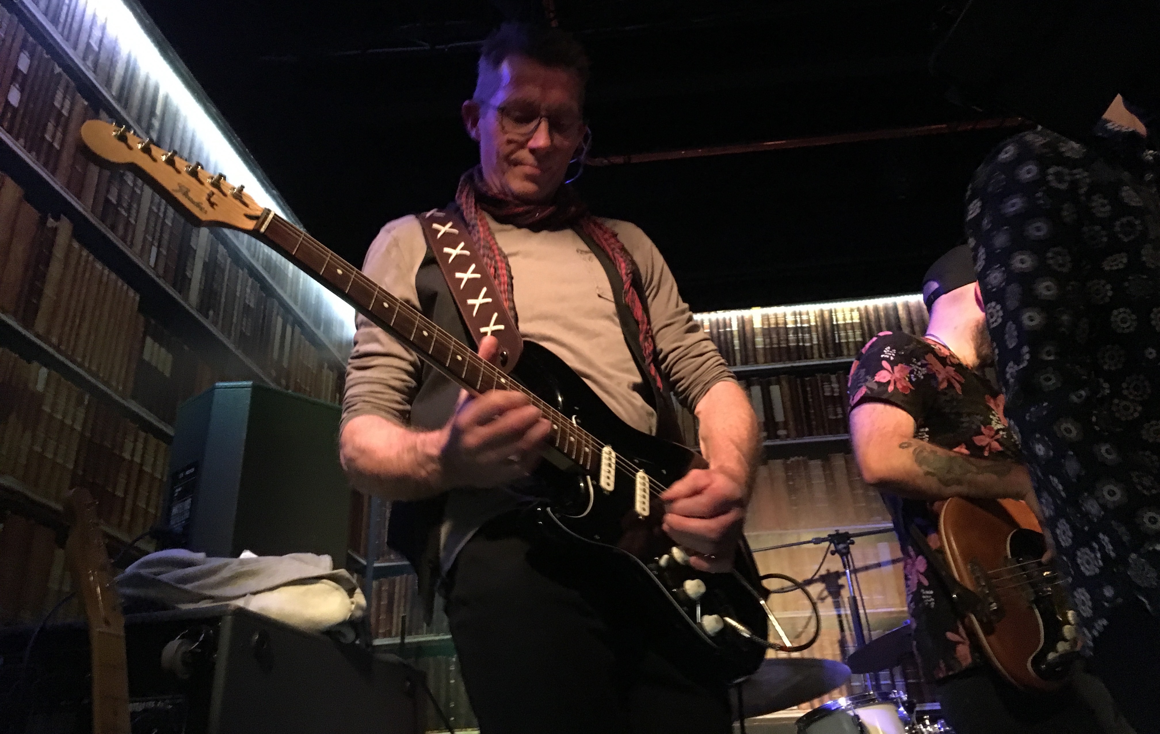 Bull bar är, för er som inte varit där, en långsmal restaurang där scenen är lokaliserad i den inre delen. Jag skulle gissa att om det är 150-160 personer i lokalen så är det fullt. Scenens ”Backdrop” (egentligen väggen) är utformad med fototapet att likna ett bibliotek. Ryggar av böcker så långt ögat kan se. Originellt. Lagom till att spelningen ska börja har ytterligare mat- och dryckesgäster anlänt lokalen och det är nog ett drygt 100-tal som förväntansfullt rör sig mot scenen när de startar.