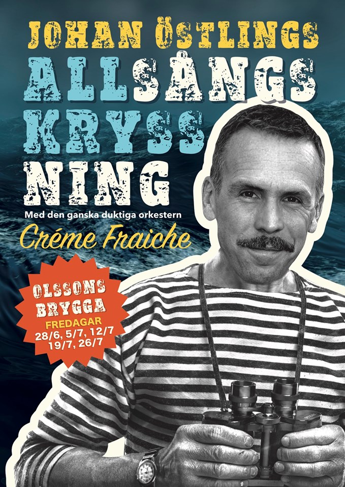 Den omåttligt populäre Johan Östling återkommer till Arvika och Olssons brygga under fem fredagar. Han har fått slita sig från lek- och bakprogram i TV. Med sig till Arvika har Östling bandet ”Créme Fraische” och tillsammans med dem kommer han att leda quiz och allsång med publiken. Till fredagens premiär har jag förstått att det är hårt tryck på biljetterna. Entrén kostar 150 kronor och då ingår allsångshäftet.