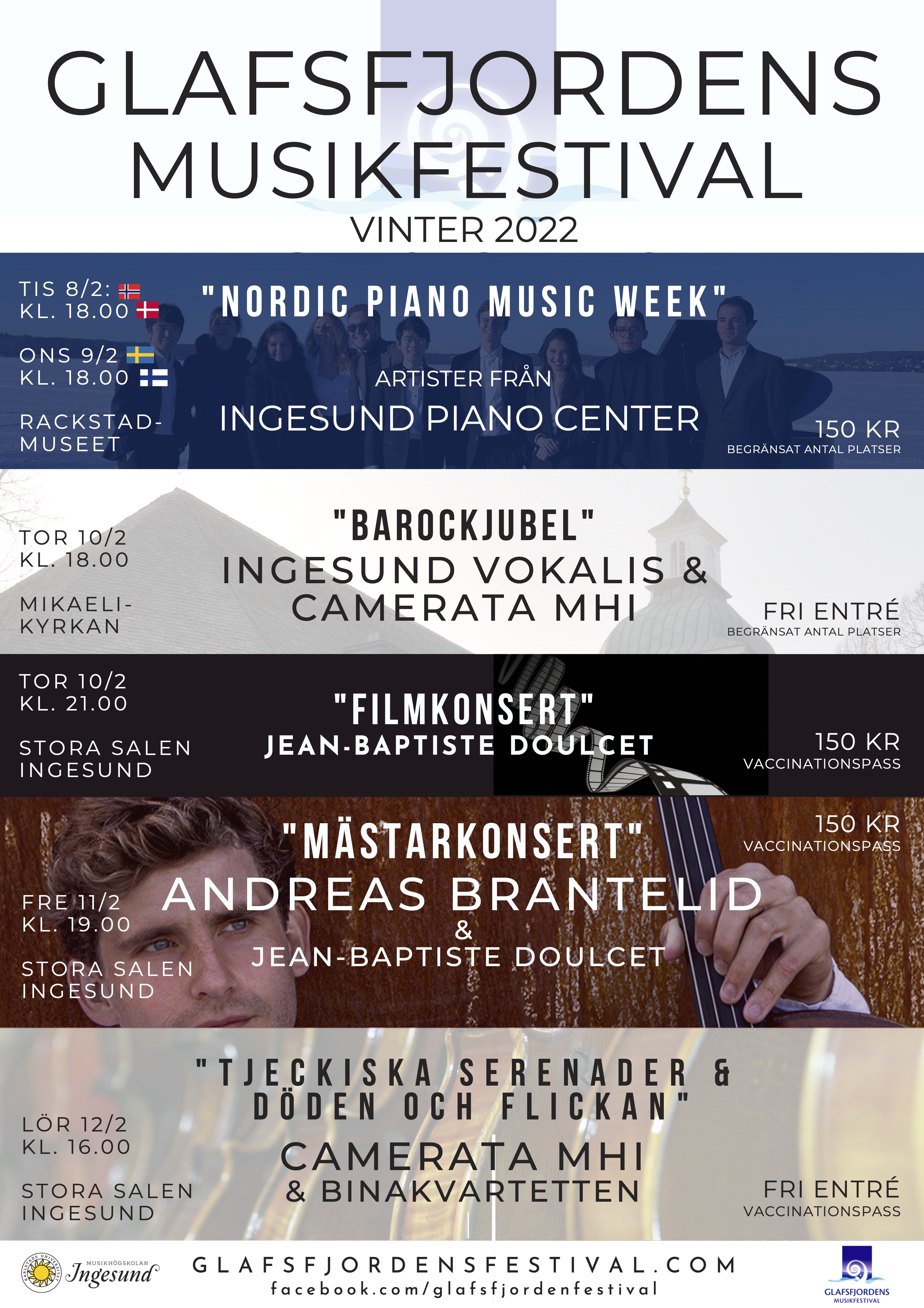 Igår kom nyheten som många längtat efter. Sverige tar bort alla restriktioner den 9 februari. Och även om pandemin inte är över och smittspridningen fortsatt är hög så blir det på ett sätt mycket enklare att planera och genomföra arrangemang. Och ja, det kommer säkert att vara en övergångsperiod med regler, Vaccinationsbevis o.s.v. Men ändå. Någon form av ”normalt läge” igen. Lagom till denna förändring så är det dags för 2022 års upplaga av kammarmusikfestivalen: Glafsfjordens Musikfestival.