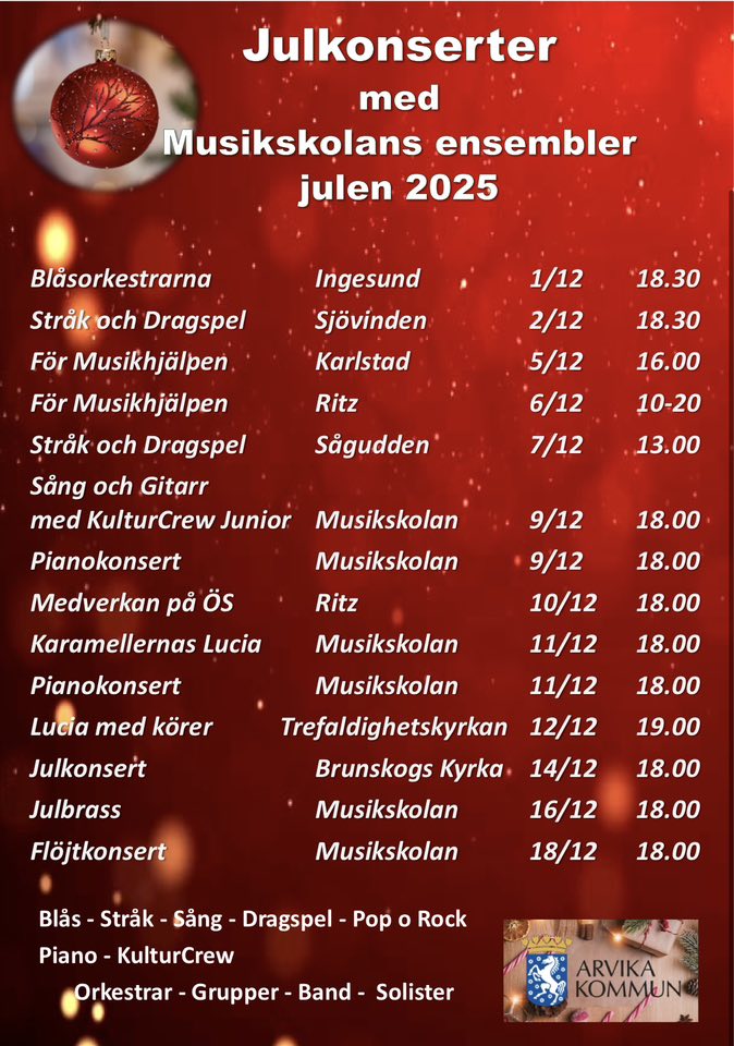 16.00, Arvika Sporthall, Julkonsert, Musikhögskolan Ingesund. tudenterna bjuder på ett brett spektrum av julmusik – från klassiskt till lekfullt, från finstämt till festligt. Solister, körer, orkestrar – alla samlas för att skapa en kväll fylld av värme, glädje och musikalisk briljans.